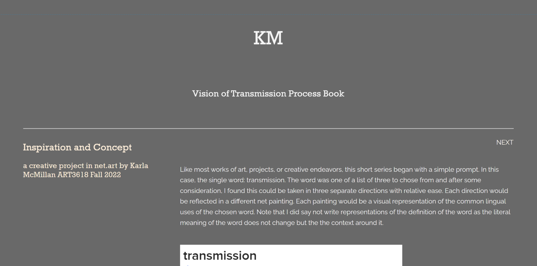 The following is a creative project in net.art that was built around the prompted word "transmission." The three works individually address or draws from three different common uses of the given word. The first approaches the transmission of vehicles; the second the spreading of disease between natural creatures; and third transmission as a noun referring to the sending of power, data, or electricity. Mechanism, meta, and biology. Each loosely connected through the frequent application of a single word. If you are interested in reading and seeing how this project was created, a process book is listed here to explain that. For the best experience, please view these works at a screen size of at least 1000px wide.